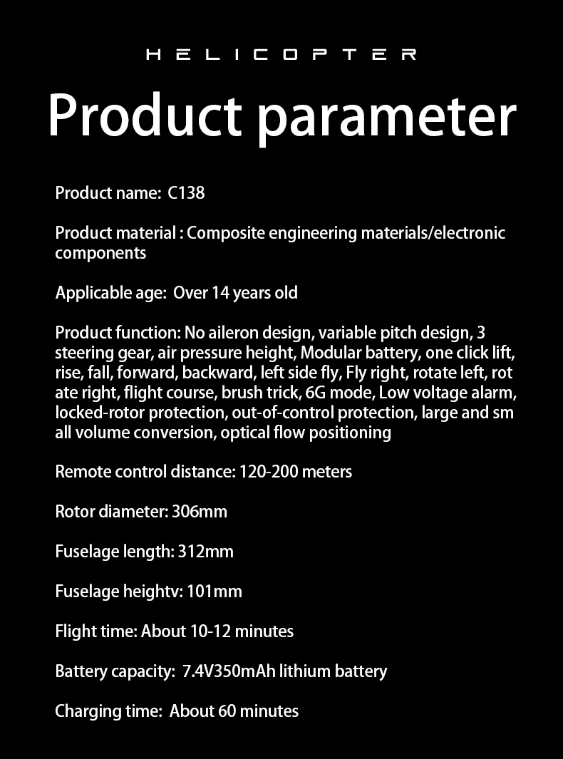Helicopter Dimensions: 235 mm (length), 256 mm (rotor diameter), 81 mm (height)